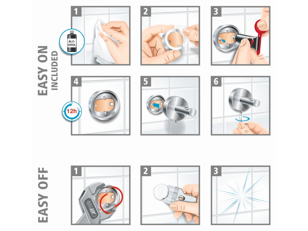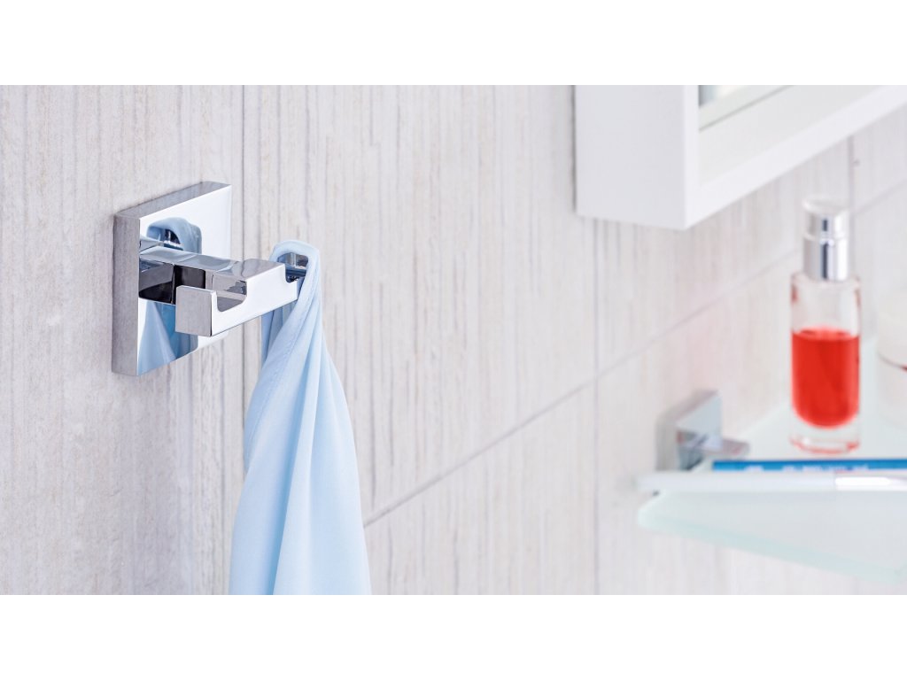Dvojitý háček Deluxxe je luxusním doplňkem do každé moderní koupelny. Symetrické dvojité háčky jsou vkusně tvarované, nadčasový lesklý chromovaný povrch slibuje dlouhou výdrž. Háček se na stěnu snadno nalepí, žádné vrtání není zapotřebí. Tím ho můžete umístit zcela libovolně dle vaší fantazie. Při instalaci tak nedochází k poškození žádného povrchu či zařízení pod povrchem (rozvody vody, elektřiny apod.). Lepidlo po instalaci do základny plně vyschne za 12 hodin. Univerzální základnu je možné kdykoli rychle a beze stop demontovat bez zanechání stop. Opětovné nalepení na jakékoliv jiné místo či do zcela jiné koupelny pak snadno provedete s novým adaptérem BK20, který je běžně dostupný jako náhradní díl.